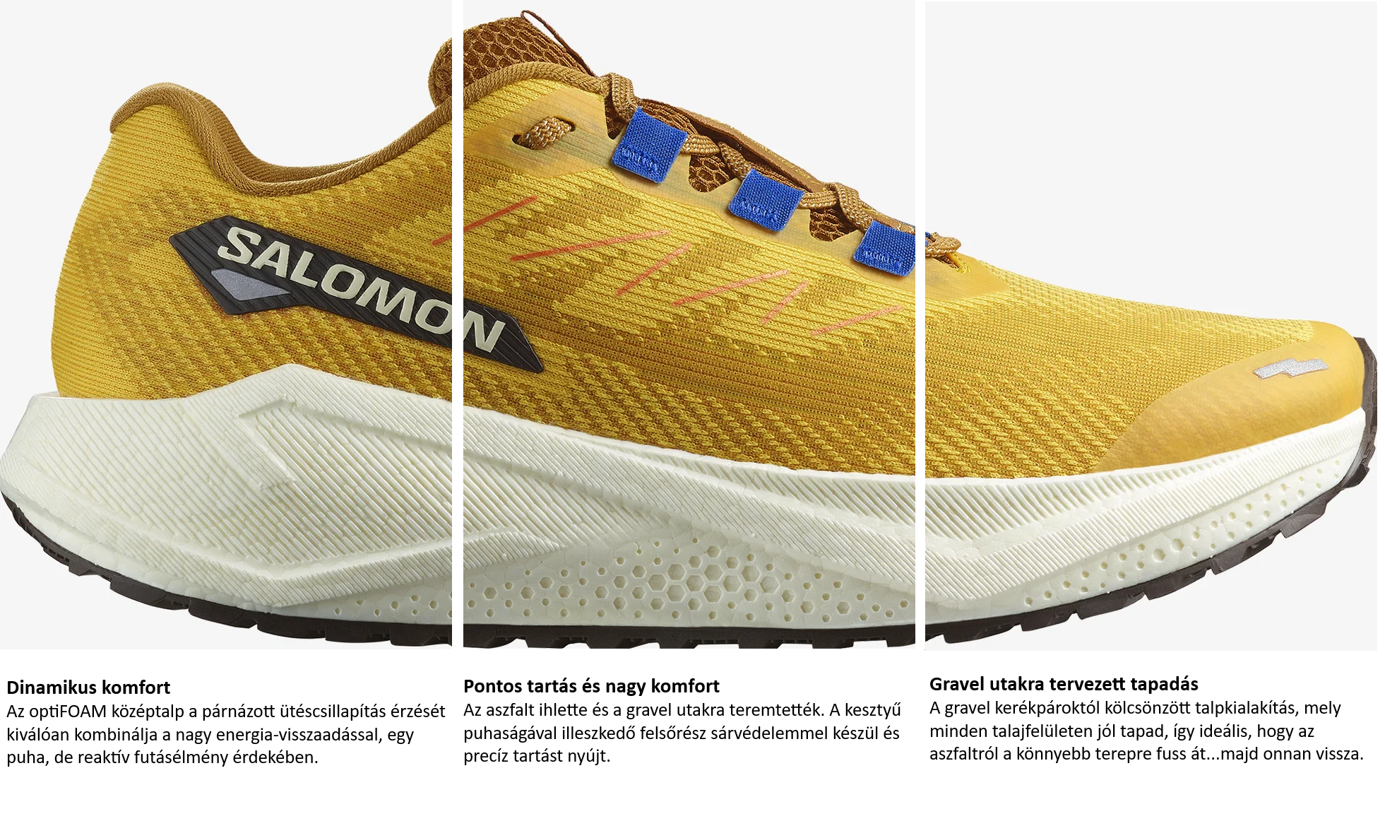 Az AERO BLAZE 3 tökéletes együttesét hozza a párnázottságnak és a dinamikának futásad során és elkísér az aszfalton túl a könnyebb terepekre is. Nem túlságosan puha, de nem is kemény középtalppal készült, az enrgyFOAM evo hab megfelelő párnázottságot biztosít a talajraérkezéskor és kiváló energiavisszaadási mutatókkal rendelkezik. A sima, magától értetődő átgördülést a támaszfázisban az ívelt rocker talpgeometria biztosítja, így gyorsan az elrugaszkodási fázisba kerülsz a futólépés alatt. sensiFIT felsőrésszel készül, mely remekül tart, de kényelmes érzést nyújt, a hálós anyag kényelmes és jól szellőzik. A külső talp tapadását a változó körülmények között a Chevron lugs mintázat biztosítja. A SALOMON legtöbb terepfutócipőjével ellentétben normál fűzőrendszerrel készül. A cipő rendkívül könnyű, kiváló edzésekre, tempósabb futásokra és versenyekre is.